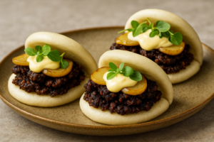 Pan bao con morcilla crujiente, manzana y alioli de ajo asado (street food para ferias y foodtrucks)