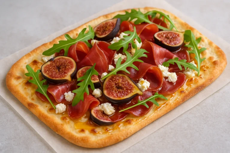 - Monta la base: pincela el flatbread con AOVE. Reparte finas lascas de mozarella (si usas), acomoda los higos y algunas rodajas de queso de cabra.