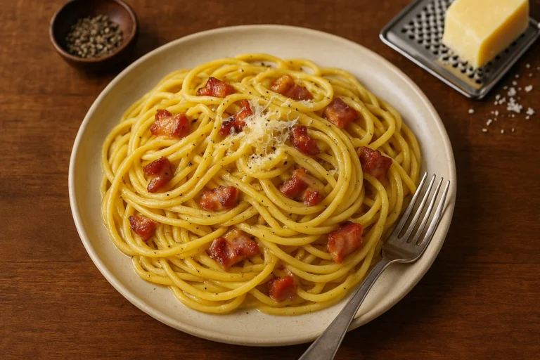 Carbonara clásica y cremosa a base de huevo + queso + agua de cocción, con el punto ahumado-salino de la panceta curada bien dorada. Lista en 15–18 minutos.